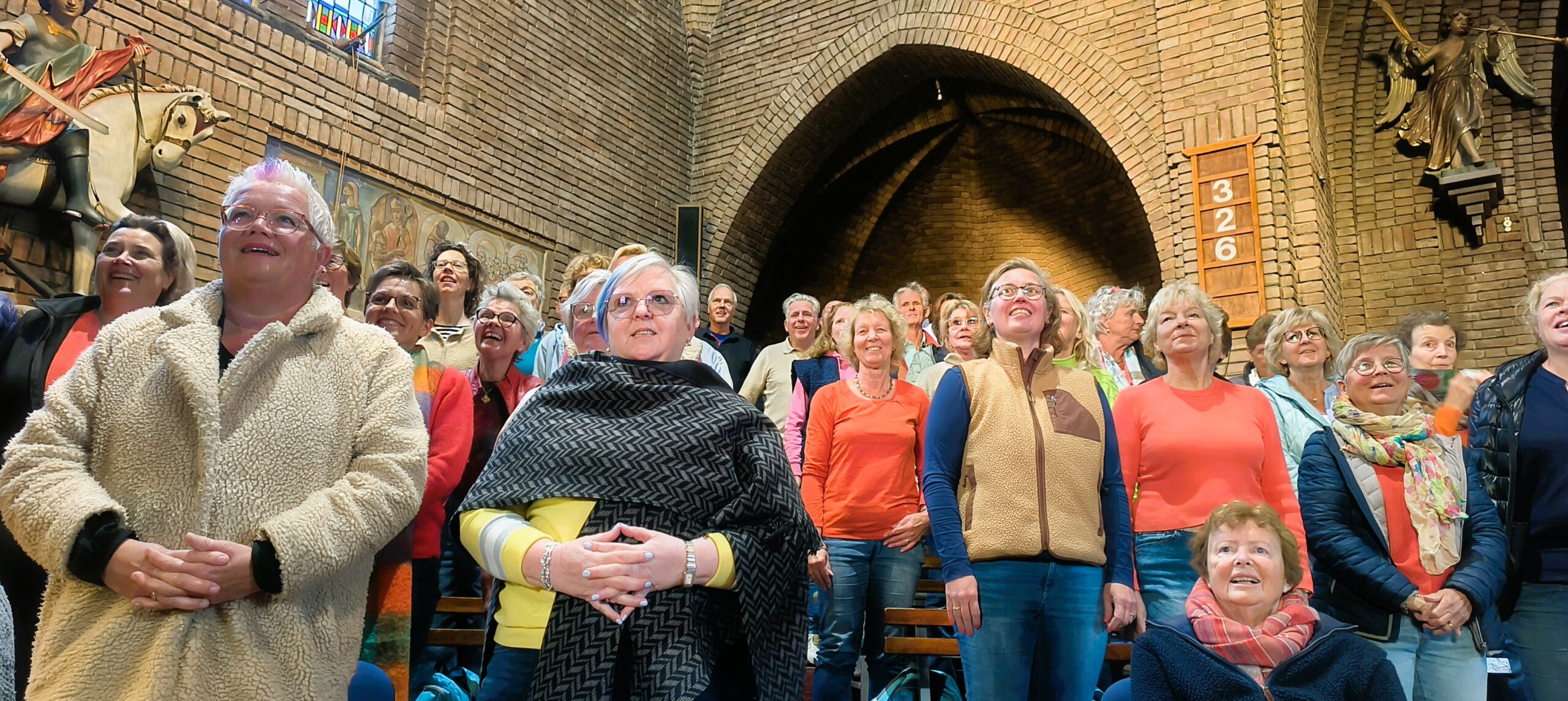 en gemoedelijke sfeer. Het wordt een middag om te genieten, om te luisteren naar het koor en mee te zingen met de bekende liederen. Bij het openingsnummer blijven we de kerkelijke roots toch een beetje trouw als Shaffy’s Zing Vecht Huil Bid Lach Werk en Bewonder op het programma staat. Krachtig en met een flink volume zingen koor en publiek onder de enthousiaste leiding van dirigent Bruce Skinner. Het combo bestaande uit Ludmilla de Klerk op piano, drummer Frits Zieltjens en gitaristen Ron