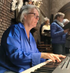 We worden op de piano met veel enthousiasme begeleid door Christine Kamp.